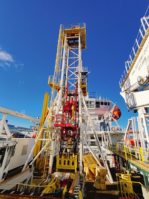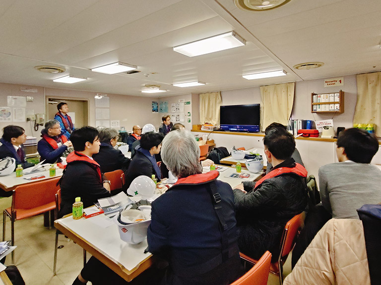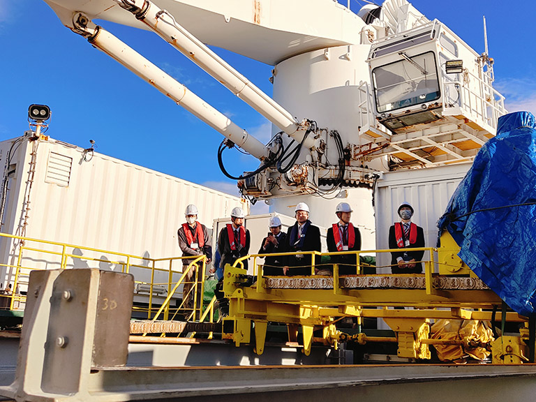 2025年12月18日に、深田サルベージ建設株式会社のご協力のもと、同社所有の多目的作業船「POSEIDON-1」の見学会を実施しました。同船は、2015年に就航、DP2による高精度な定点保持、ムーンプール、広い作業甲板等を備え、着床式洋上風力の基礎構造物設計に必要となるCPT(電気式コーン貫入)調査等の地盤調査にも活用されています。当日は、3グループに分かれて船内及び船上の施設や設備について、各所で詳しいご説明をいただきながら見学しました。